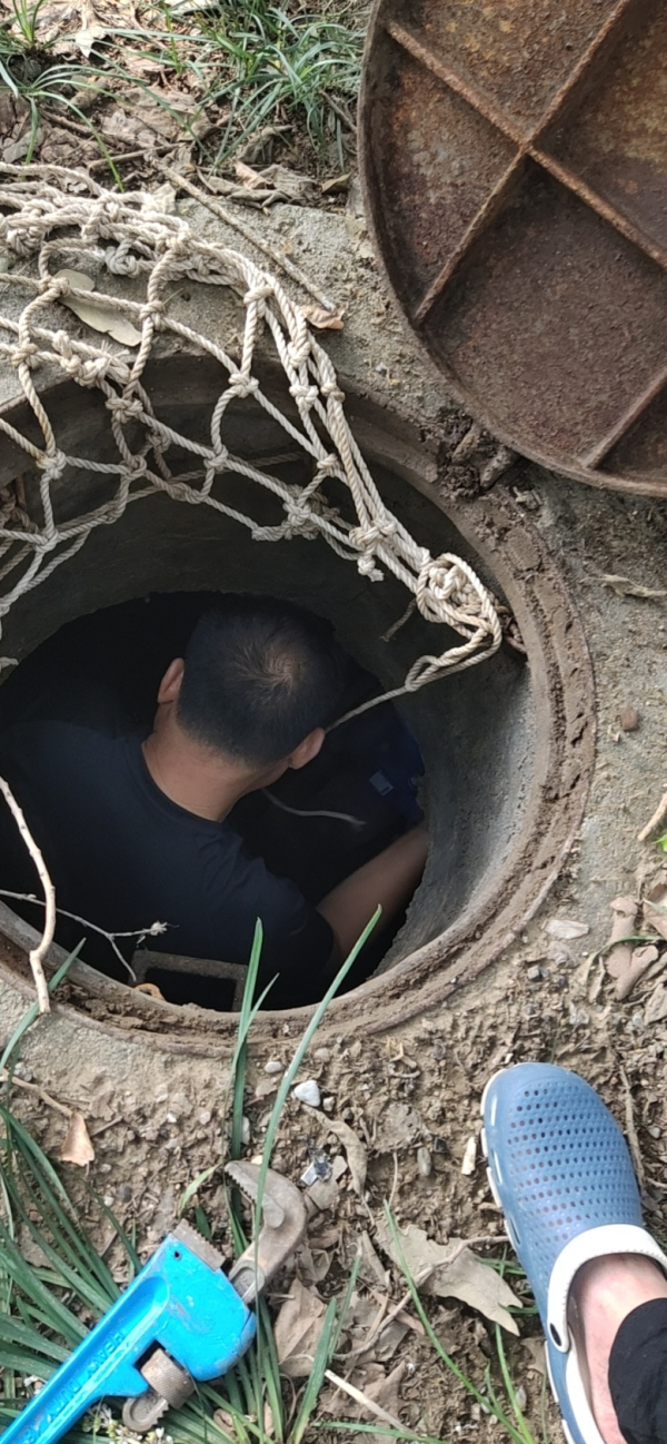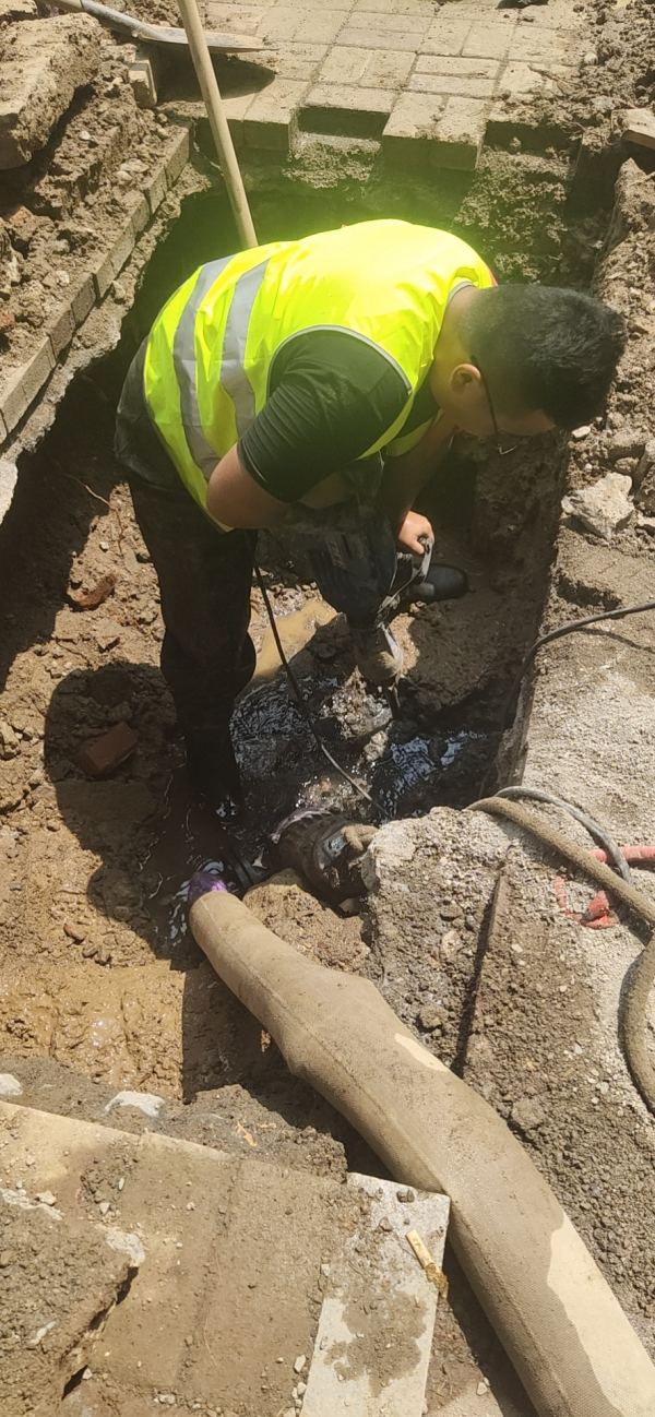 8月7日一早,孟隊帶領(lǐng)搶修隊員、檢漏隊員進入福寧小區(qū)。第一步確定有無明漏,先檢查用戶水表,排查結(jié)束未發(fā)現(xiàn)漏水。第二步打開小區(qū)所有井蓋逐一排查,發(fā)現(xiàn)有流水的窨井,搶修隊員下到井室取水樣,分析、檢測、區(qū)別、排查,一個不是再到下一個井室,從早上排查到晚上,排查二十幾個后,終于在福寧小區(qū)8號樓前井室測試是自來水,至此確定附近有暗漏,這時指針已經(jīng)是22:47分。第三步檢漏隊員使用專用“武器”。8月8日00:10分,精準定位暗漏點位置,確定該管線是de110PE管漏水。為了不打擾居民夜間休息,定于8月8日8:30分施工。施工隊按照搶修方案快速有序、高效完成搶修任務(wù),于15:02分一次送水成功,福寧小區(qū)壓力恢復正常。